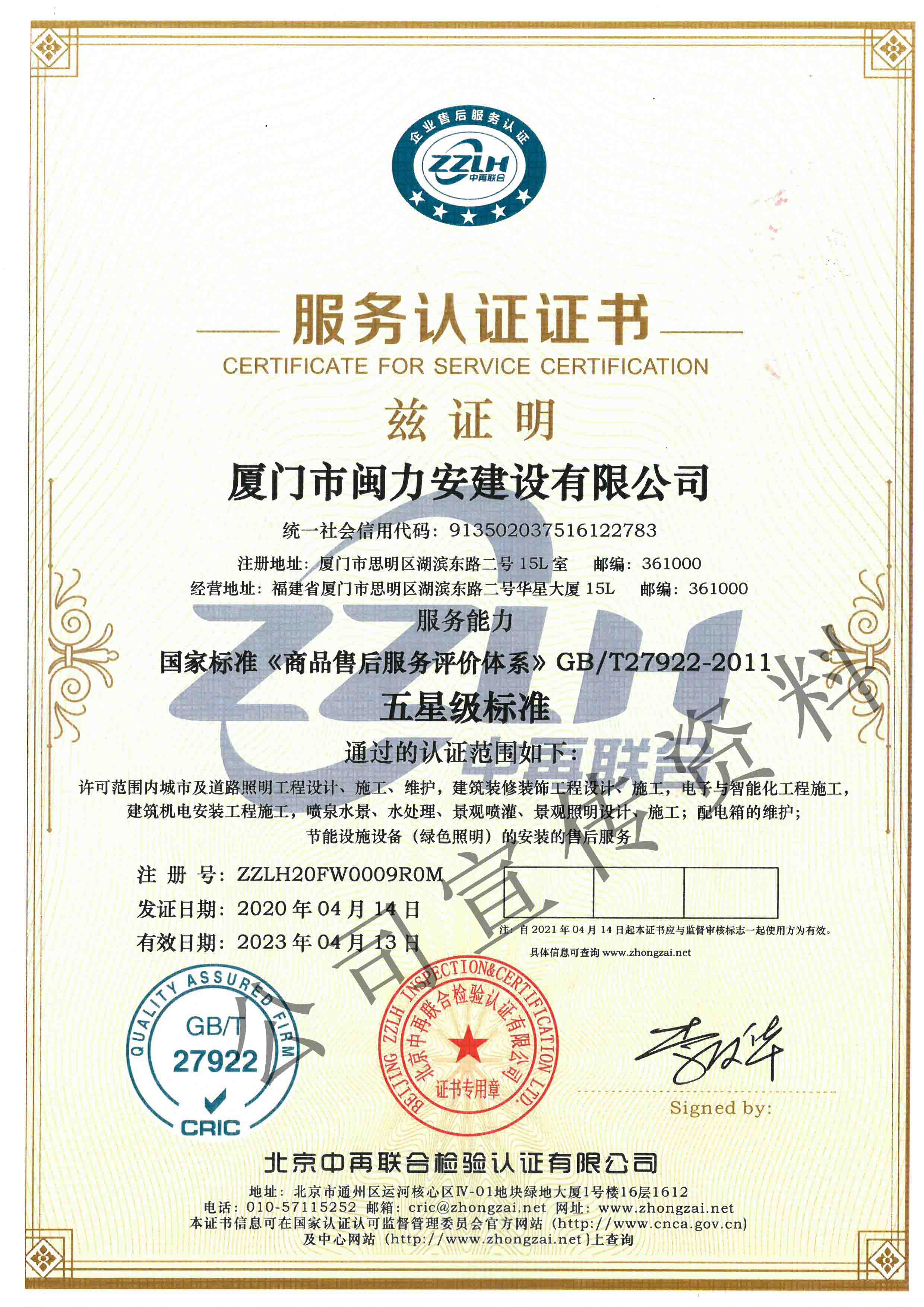 廈門市閩力安建設(shè)有限公司成立于2003年,公司取得市政公用工程施工總承包貳級、建筑裝修裝飾工程專業(yè)承包壹級、城市及道路照明工程專業(yè)承包壹級、電子與智能化工程專業(yè)承包貳級、消防設(shè)施工程專業(yè)承包貳級、電力工程施工總承包叁級、建筑機電安裝工程專業(yè)承包叁級、輸變電工程專業(yè)承包叁級、環(huán)保工程專業(yè)承包叁級、照明工程設(shè)計專項甲級、建筑裝飾工程設(shè)計乙級、施工勞務(wù)等資質(zhì)的綜合型企業(yè),公司于2013年通過了ISO9001質(zhì)量體系認證,ISO14001環(huán)境管理體系認證,OHSAS18001職業(yè)健康安全管理體系認證。